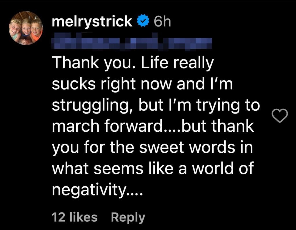 “Thank you,” Rycroft replied. “Life really sucks right now and I’m struggling, but I’m trying to march forward….but thank you for the sweet words in what seems like a world of negativity….”