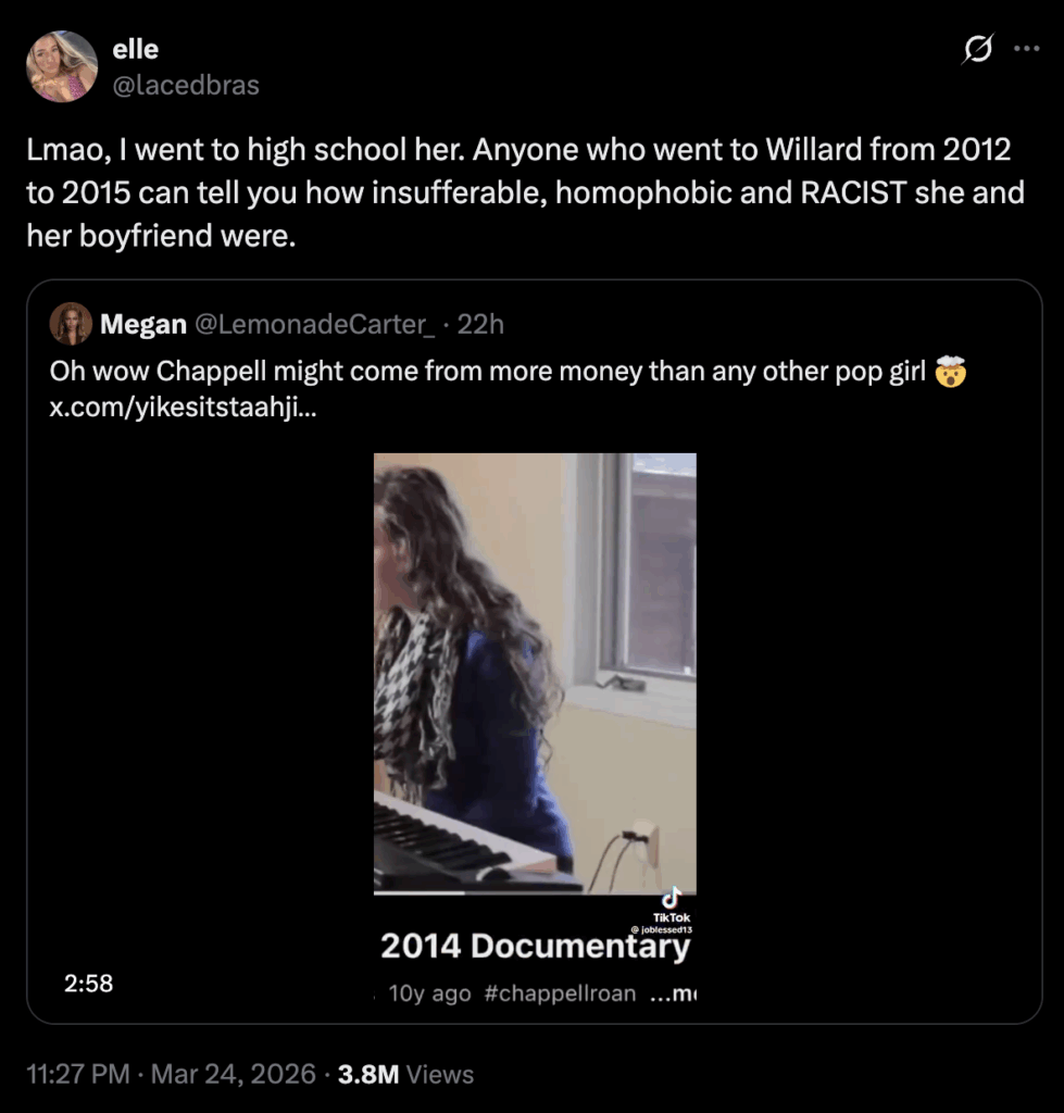 But many believe that Roan’s case is different, as she’s allegedly presented herself as rising from poverty, despite the fact that, as one X (formerly Twitter) user alleged, “Chappell might come from more money than any other pop girl.”